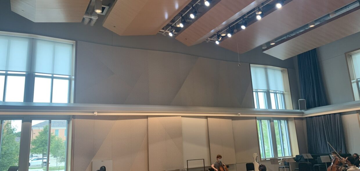 The rehearsal classrooms needed a variable amount of absorption and reflection. The result is a moveable panel set with a variety of core materials resulting in very specific conditions throughout the space as the instructors’ needs vary. The look of the panels is screen-printed artwork with the pattern matched up along multiple panel depths.